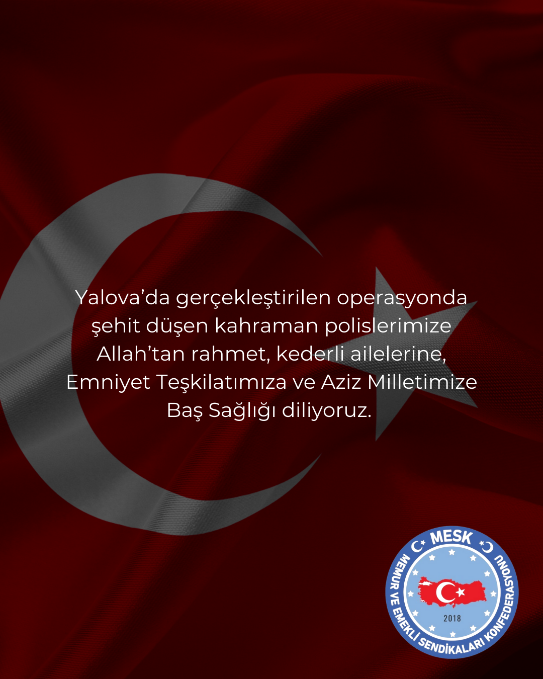 Yalova'da gerçekleştirilen operasyonda şehit düşen kahraman polislerimize Allah'tan rahmet, kederli ailelerine, Emniyet Teşkilatımıza ve Aziz Milletimize Baş Sağlığı diliyoruz.