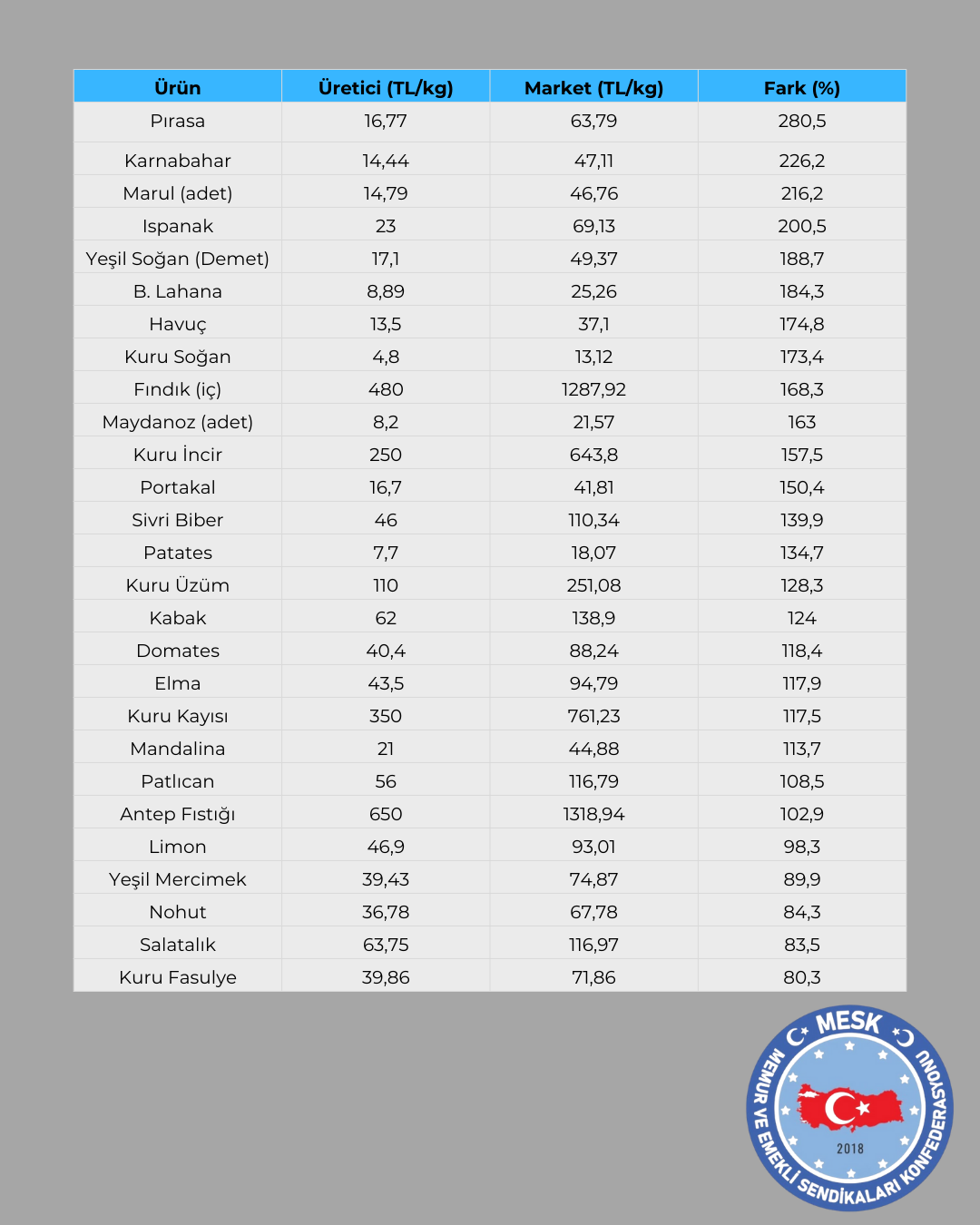 Türkiye Ziraat Odaları Birliği’nin yayımladığı verilere göre sebze ve meyvede üretici fiyatı ile market fiyatı arasındaki fark bazı ürünlerde %280’e kadar ulaşmaktadır. Bu oran, ürünün üreticiden çıktıktan sonra yaklaşık üç katına varan bir artışla tüketiciye ulaştığını göstermektedir.